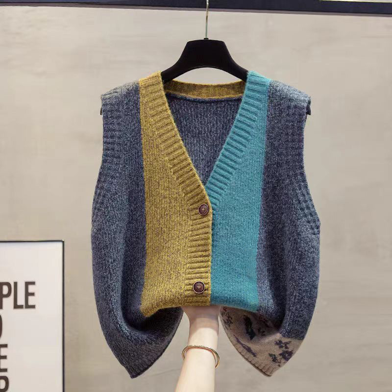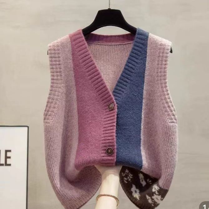 春季新款 拼色V領針織衫 馬甲背心 寬鬆簡約 外穿開衫 坎肩毛衣